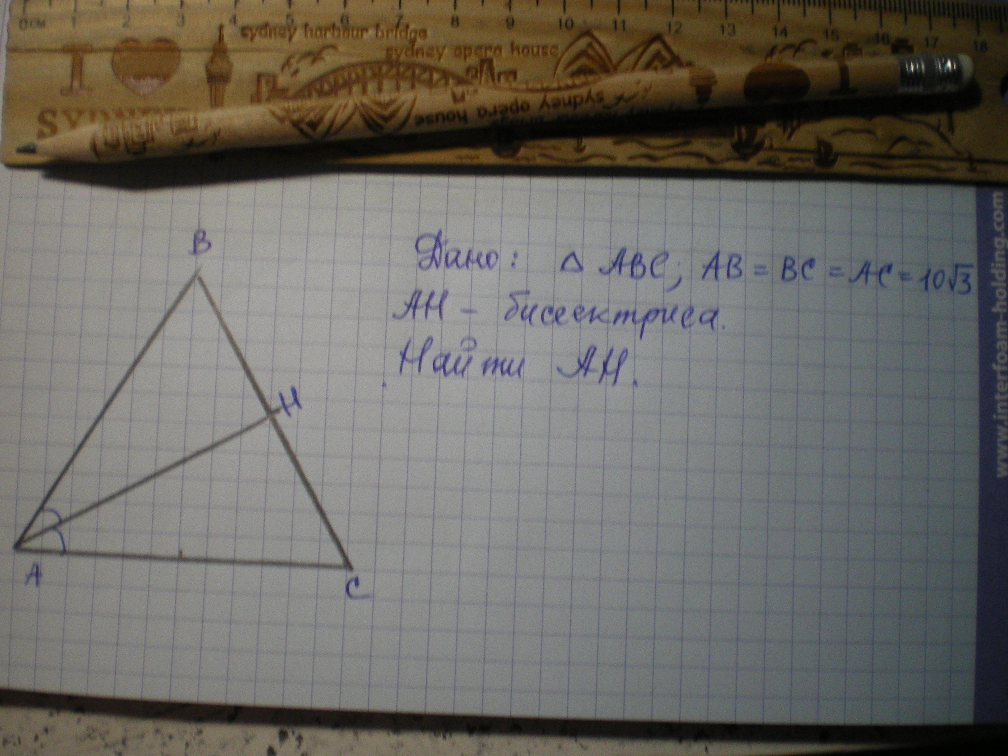 В равностороннем треугольнике биссектриса является медианой и высотой, поэтому треугольники АВН и АСН - прямоугольные, а ВН = СН = 5√3.