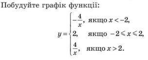 Покрокове пояснення :   ;   ; Дана функція неперервна і складена із трьох частин ( ліній ) ,   ;   ; які будуємо за точками :   ;   ; 1)   ; ( - 8 ; 1 / 2 ) , ( - 4 ; 1 ) , ( - 2 ; 2 ) - кусок гіперболи у = - 4 / х ;   ;   ; 2)   ; ( - 2 ; 2 ) , ( 2 ; 2 ) - відрізок прямої   ; у = 2 ( паралельна Ох ) ;   ;   ; 3)   ; ( 2 ; 2 ) , ( 4 ; 1 ) , ( 8 ; 1 / 2 ) - кусок гіперболи у = 4 / х .